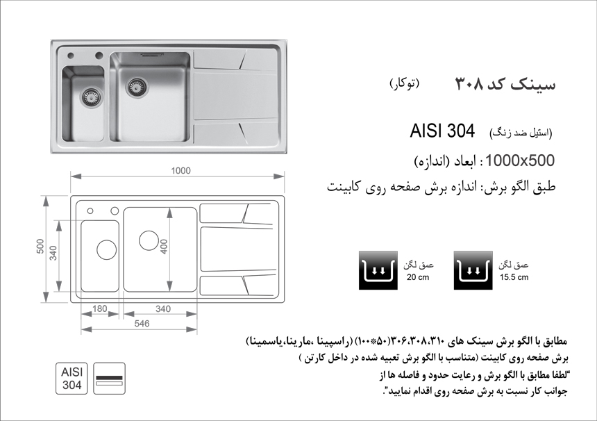 سینک استیل توکار اخوان کد 308، تجربه‌ای از کیفیت و زیبایی را به آشپزخانه شما می‌آورد. با طراحی مدرن و جنس استیل ضد زنگ، این سینک مقاومت بالا و دوامی استثنایی دارد. نصب آسان، تمیزی سریع و ظاهر شیک، همه آن چیزی است که برای تکمیل فضای آشپزخانه‌تان نیاز دارید. همین حالا خرید کنید و از تخفیفات ویژه بهره‌مند شوید!