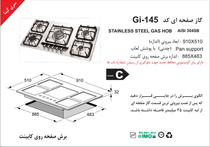 گاز رومیزی کد Gi145 اخوان دارای صفحه ای از جنس استیل دارای 5 شعله ، قطعات ایرانی ، ولوم باکالیت، وک و فندک الکتریکی و ترموکوپل است.این اجاق گاز در دسته سری گیتا تولید شده است.
