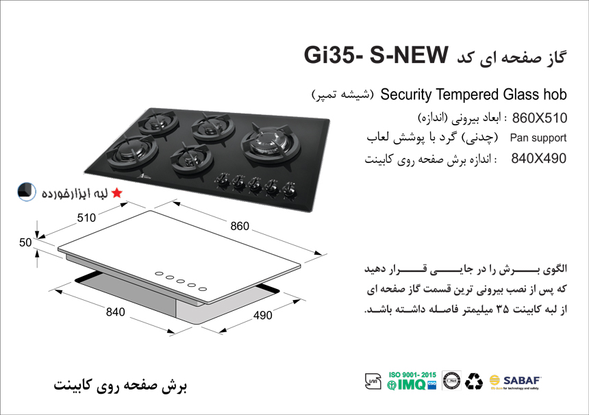 گاز صفحه ای کد Gi35-S اخوان دارای 5 شعله شامل 1 شعله کوچک ، 2 شعله متوسط ، 1 شعله بزرگ , 1 شعله پلوپز می باشد.